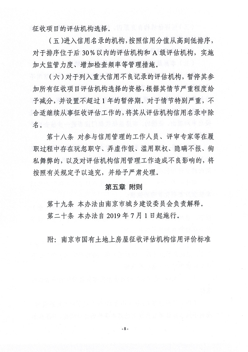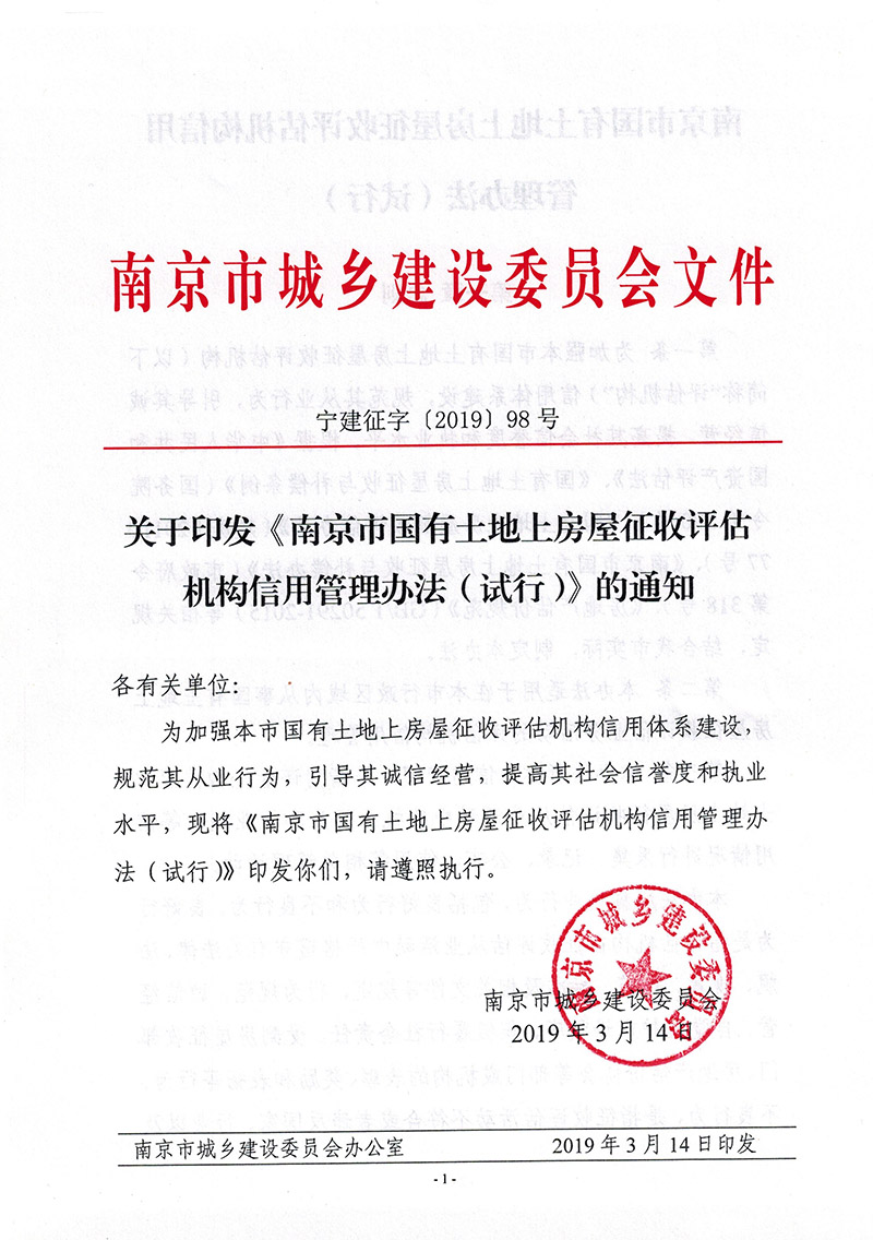 行业监管制度:宁建征字〔2019〕98号 关于印发《南京市国有土地上房屋征收评估机构信用管理办法(试行)》的通知
